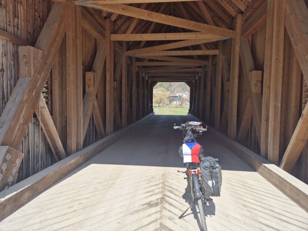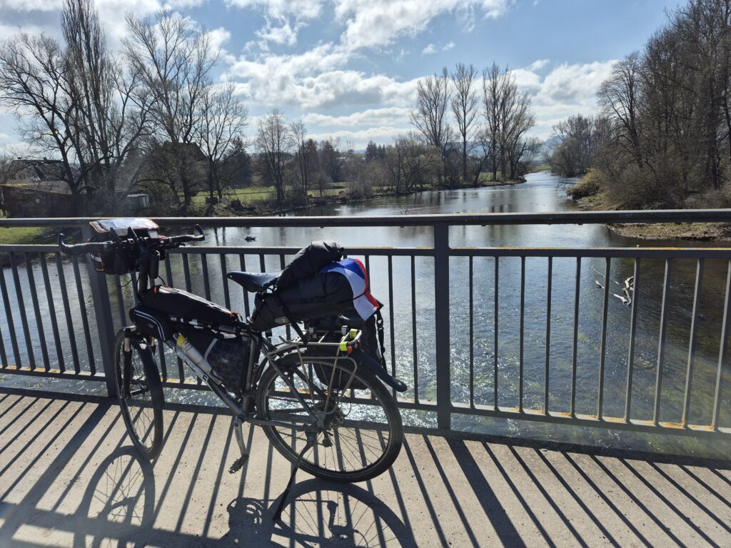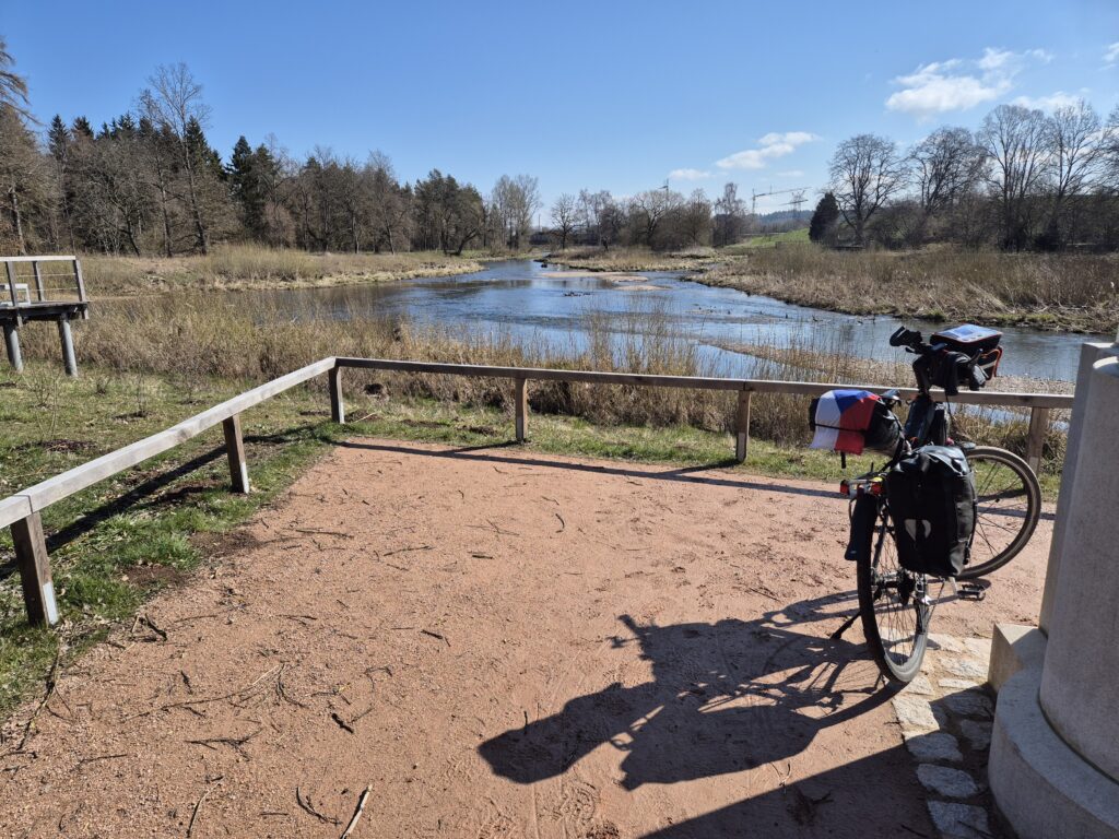 Ve čtvrtek 2. 4. 2026, chvíli po 10. hodině dopoledne jsem na místě. Projel jsem si to menší, tiché a ospalé městečko směrem k soutoku, kde je zřejmě známé sousoší. Tady jsem si udělal pár fotek, „nadýchal“ se čerstvého 8°C chladného vzduchu, který prosvěcuje a prohřívá sluníčko. Ve městě a cestou jsou ještě zbytečky sněhu, ale zřejmě brzy zmizí úplně. Sluníčko opravdu pěkně hřeje a pofukuje lehounký vánek. Samozřejmě proti… Ale jinak mi na celý výlet vyšlo počasí skvěle. Shrnu to v kostce: První noc byla chladné 2°C, úplněk a ráno jinovatka. S postupující cestou bylo tepleji, přes den hřeje sluníčko a v noci bylo 5 a 9 °C. Co mi ukazoval tachometr. Pofukoval takový slabý, ale protivný protivánek. Čtvrtek, pátek a sobota krásné slunečné dny. V neděli bylo zataženo, pod mrakem, odpoledne slabé mrholení, s asi dvěma celkem slušnými deštíky. Před kterými jsem se schoval. Předrezoval jsem do deště a pokračoval dál. Naznal jsem, že v tom mrholeníčku dojedu až do Lince, přebukuju bus a vyrazím k domovu o den dříve. Abych doma trochu zregeneroval. Přeci jenom, na trošku delší projižďce na kole jsem byl naposledy o Vánocích na Balatonu… Takže kondice mého pozadí není úplně topová :-)))